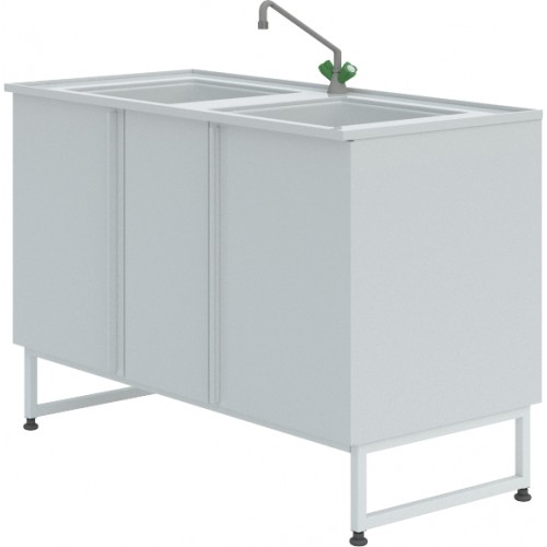 Мойка лабораторная химическая ЛК-1200 СМС-ПВ (2 раковины, 1 смеситель) для посуды устанавливается на прочный металлический сборно-разборный каркас с полимерным покрытием серого цвета.