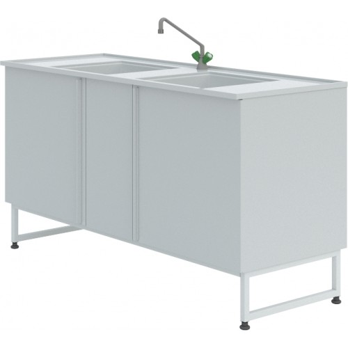 Мойка лабораторная химическая ЛК-1500 СМС-ПВ (2 раковины, 1 смеситель) для посуды устанавливается на прочный металлический сборно-разборный каркас с полимерным покрытием серого цвета.
