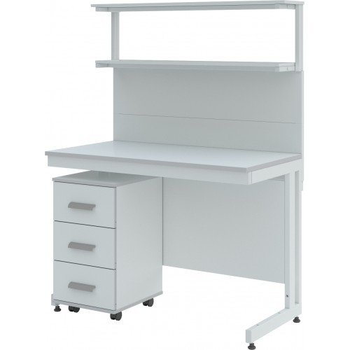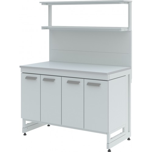 Стол лабораторный с двумя полками ЛК-1200 СП состоит из прочного сборно-разборного металлического каркаса с полимерным покрытием серого цвета, металлической надстройки с двумя полками из стали и столешницы.