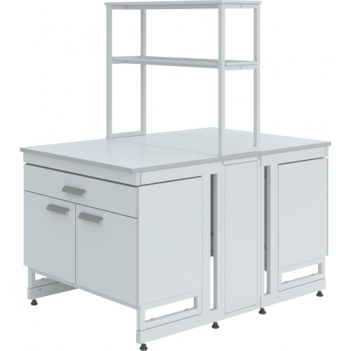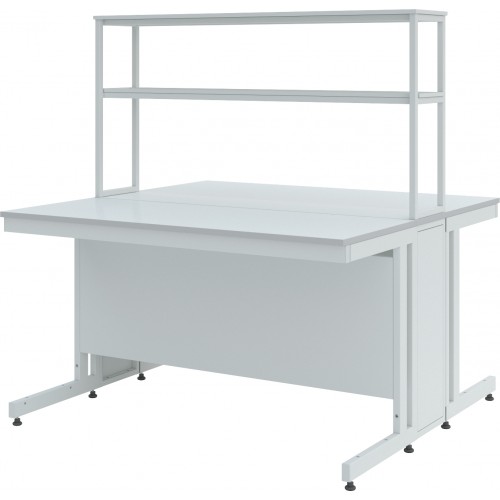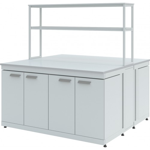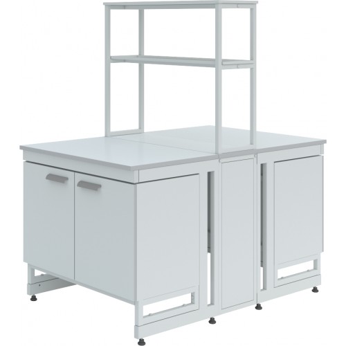 Стол островной ЛК-1200 СО состоит из прочного сборно-разборного металлического каркаса с полимерным покрытием серого цвета, технологической приставки с двумя полками из стали и столешницы.