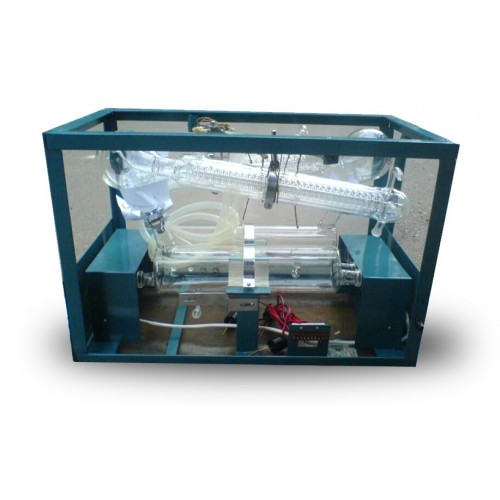 Работает по принципу двойной перегонки воды. Перегонка происходит за счет нагрева и испарения воды с помощью электрических нагревателей, помещенных в кварцевые трубки, и конденсации водяного пара конденсаторами-холодильниками.