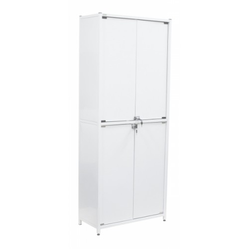 Шкаф имеет два отделения, каждое из которых имеет по две металлических двери с замком и металлические полки. В верхнем отделении две полки, в нижнем - одна.