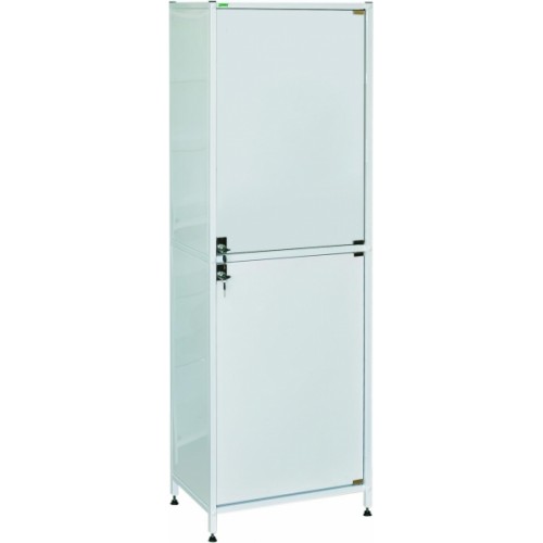 Изготовлен из листовой стали и стального тонкостенного профиля покрытый полимерно-порошковой краской. Шкаф имеет два отделения, каждое из которых имеет дверь с замком. Полки металлические. Шкаф установлен на 4 регулируемые опоры. Конструкция шкафа разборная. Может поставляться в разобранном виде, размеры упаковки см. ниже.