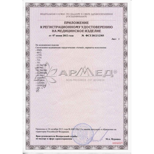 Светильник хирургический L735 (5 ламп) предназначен для освещения рабочего поля при проведении хирургических операций, а также при диагностических медицинских исследованиях в отделениях хирургии, терапии и гинекологии в лечебно-профилактических учреждениях