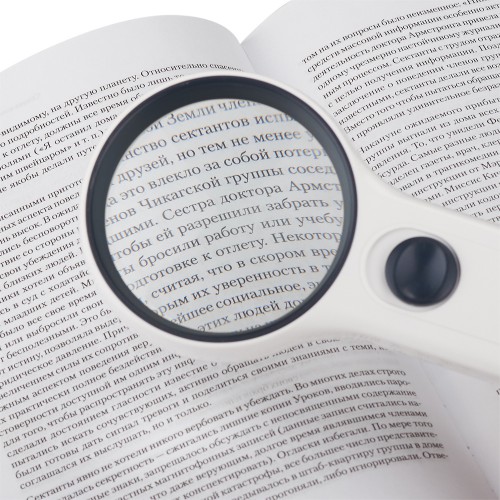 Карманная лупа с подсветкой используется в любых ситуациях, где необходима комбинация хорошего увеличения и подсветки. Работает от батареек.