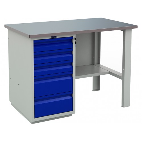 - Верстак состоит из тумбы WD5 и опоры F1. Тумба укомплектована 5-ю выдвижными ящиками. Ящики открываются на телескопических направляющих. Нагрузка на ящик 30 кг. Все ящики закрываются на центральный ключевой замок.