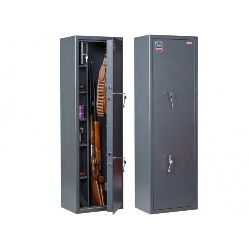 отделением, запирающимся на ключ, полками и ложементами для ружей комплектуется двумя ключевыми замками наличие анкерных отверстий для крепления сейфа к стене * линейный размер от поверхности дна до патронного