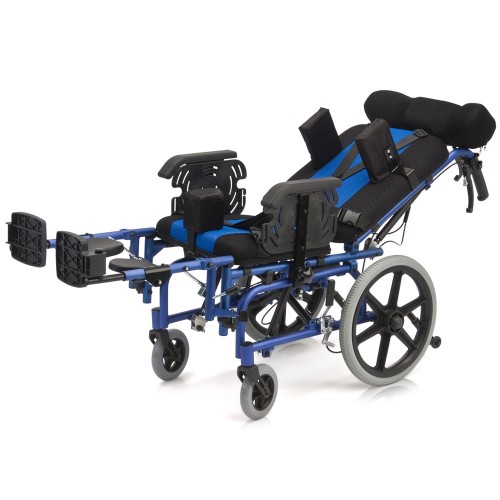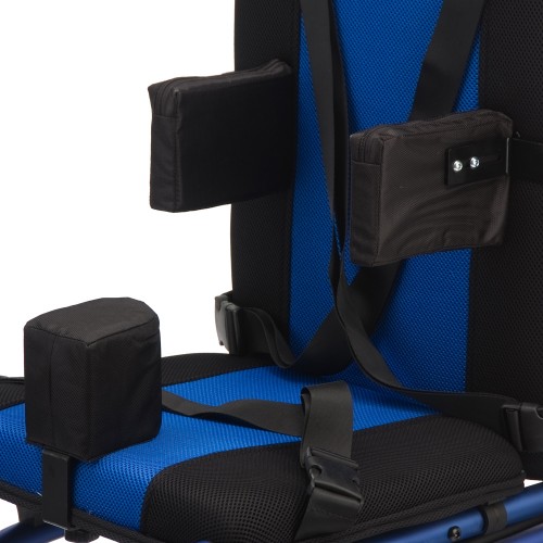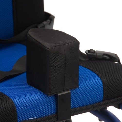 Спинка оснащена мягким, регулируемым по высоте подголовником, боковыми фиксаторами туловища, а также системой регулировки угла наклона до положения «лежа».
