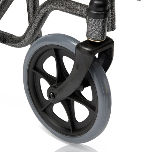 Кресло-коляска оснащена колесами, имеющими пневматические задние и передние цельнолитые шины.