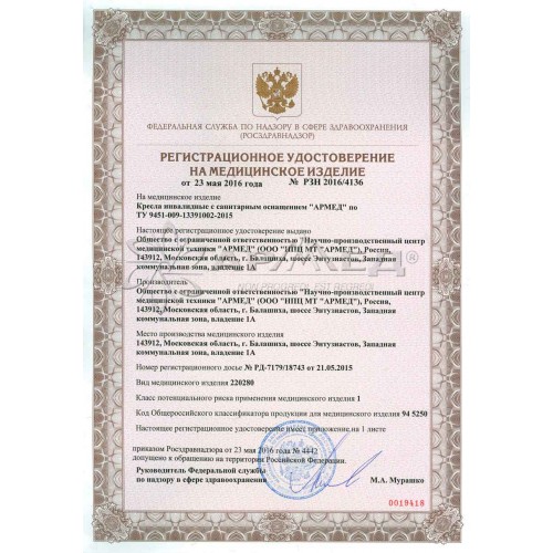 Кресло инвалидное с санитарным оснащением "АРМЕД": Н020В