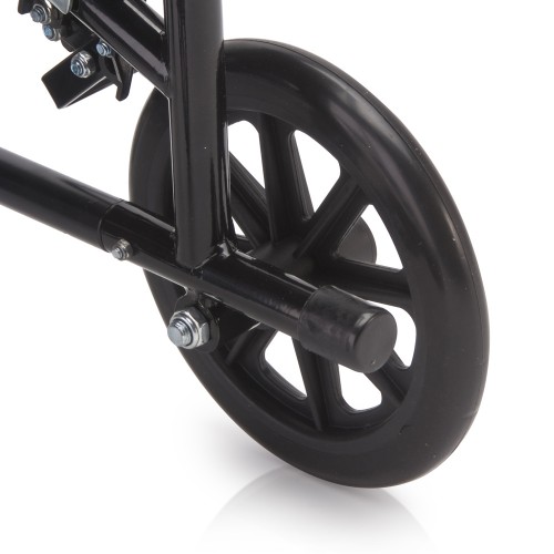 Кресло-коляска оснащена колесами, имеющие задние и передние цельнолитые шины.